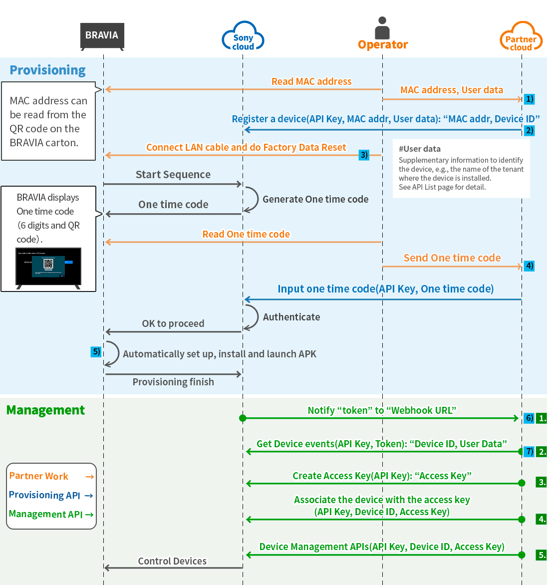Once you have received the Service Provider ID and API Key from Sony, you can begin developing your Zero-touch Provisioning and Remote Management System using the Cloud API. The following diagram outlines the sequence of steps to implement the system, with descriptions of each part provided below.