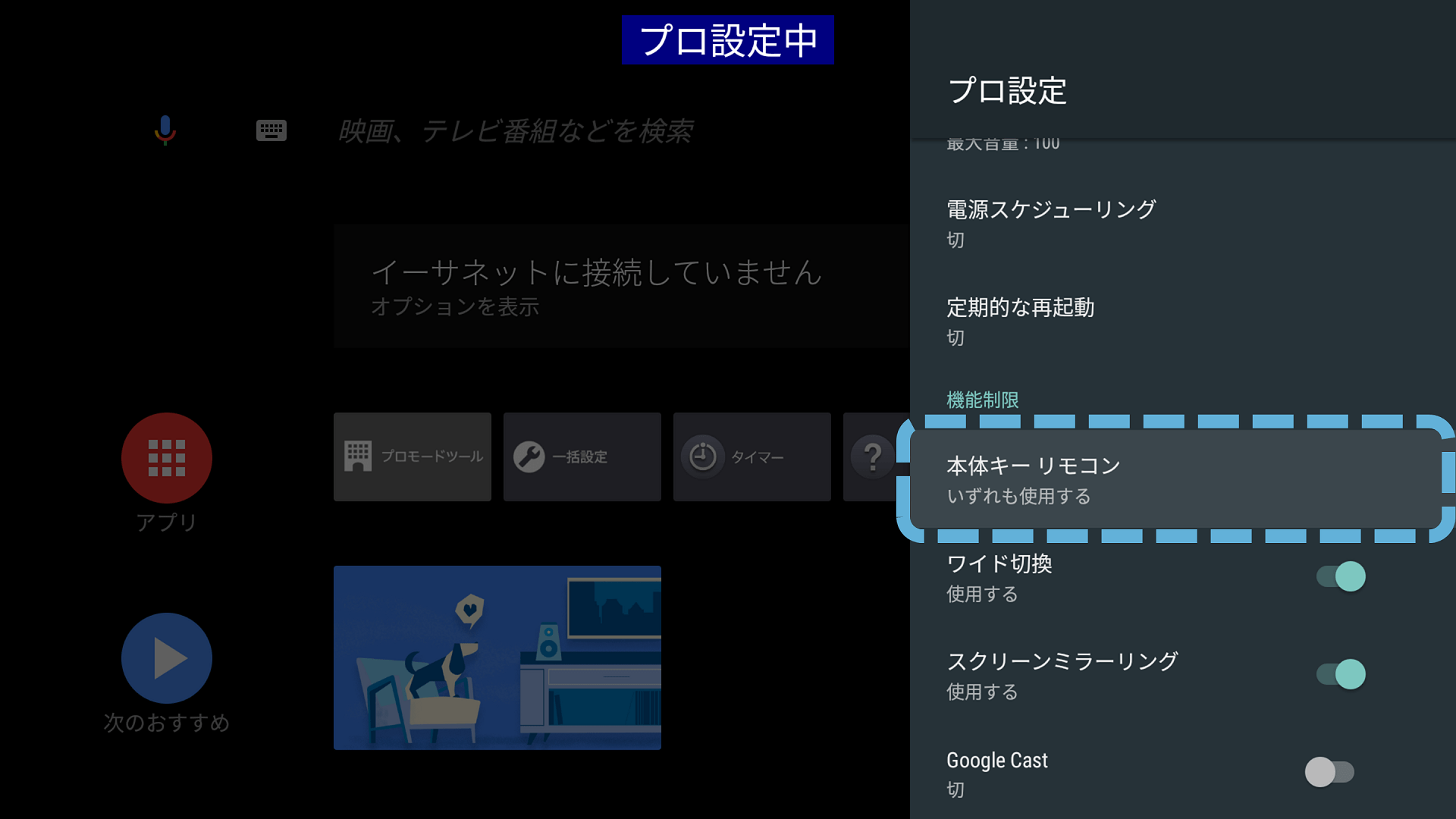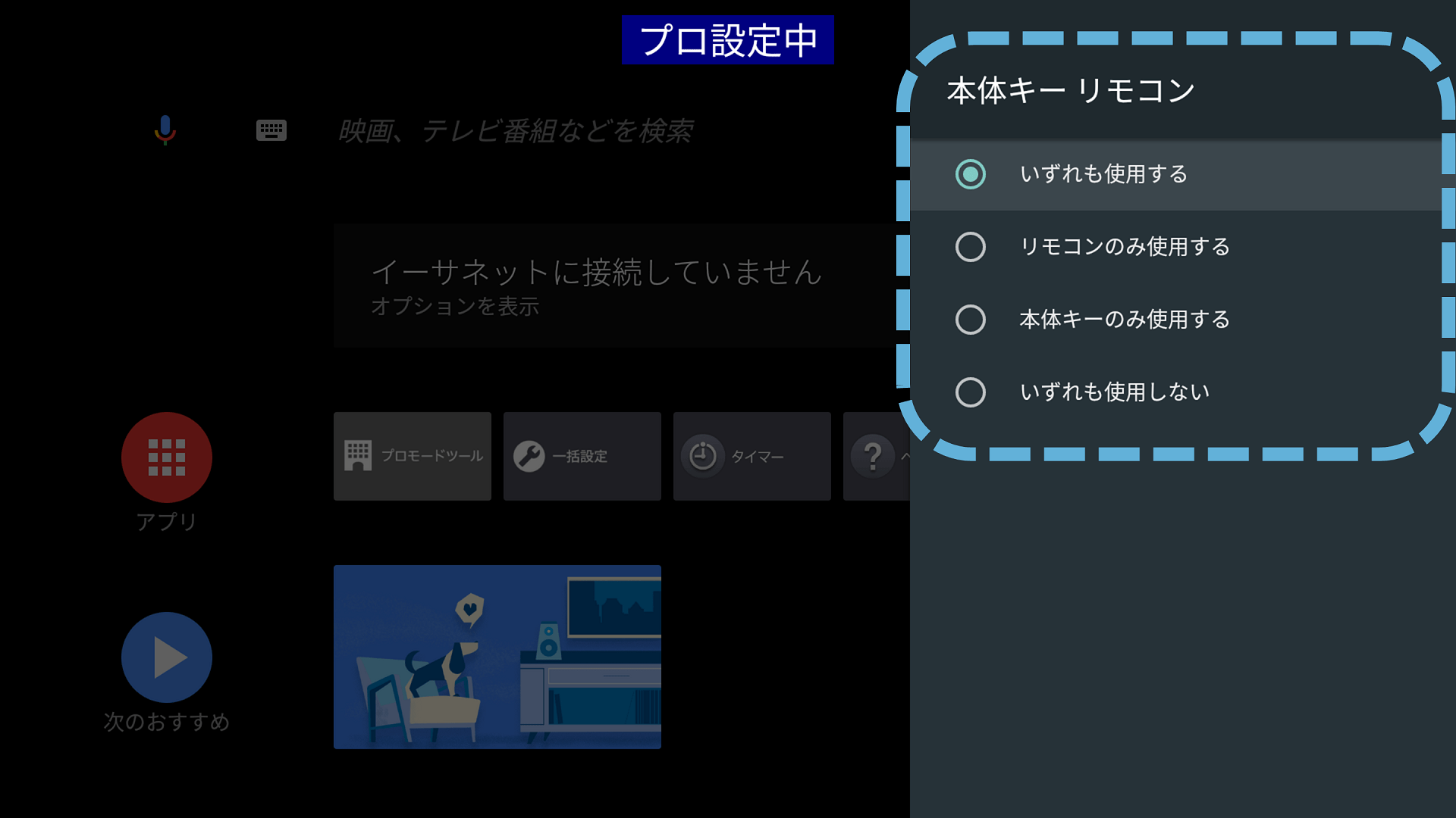 - いずれも使用する [デフォルト値]: 本体キー・リモコンの両方が使用できます。