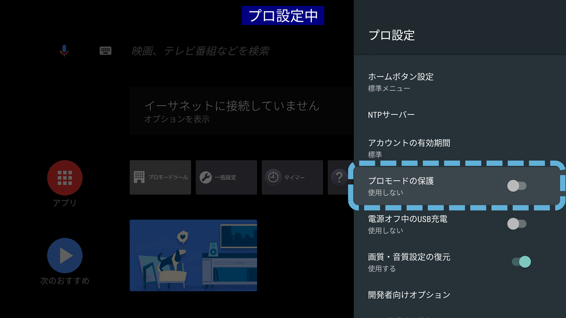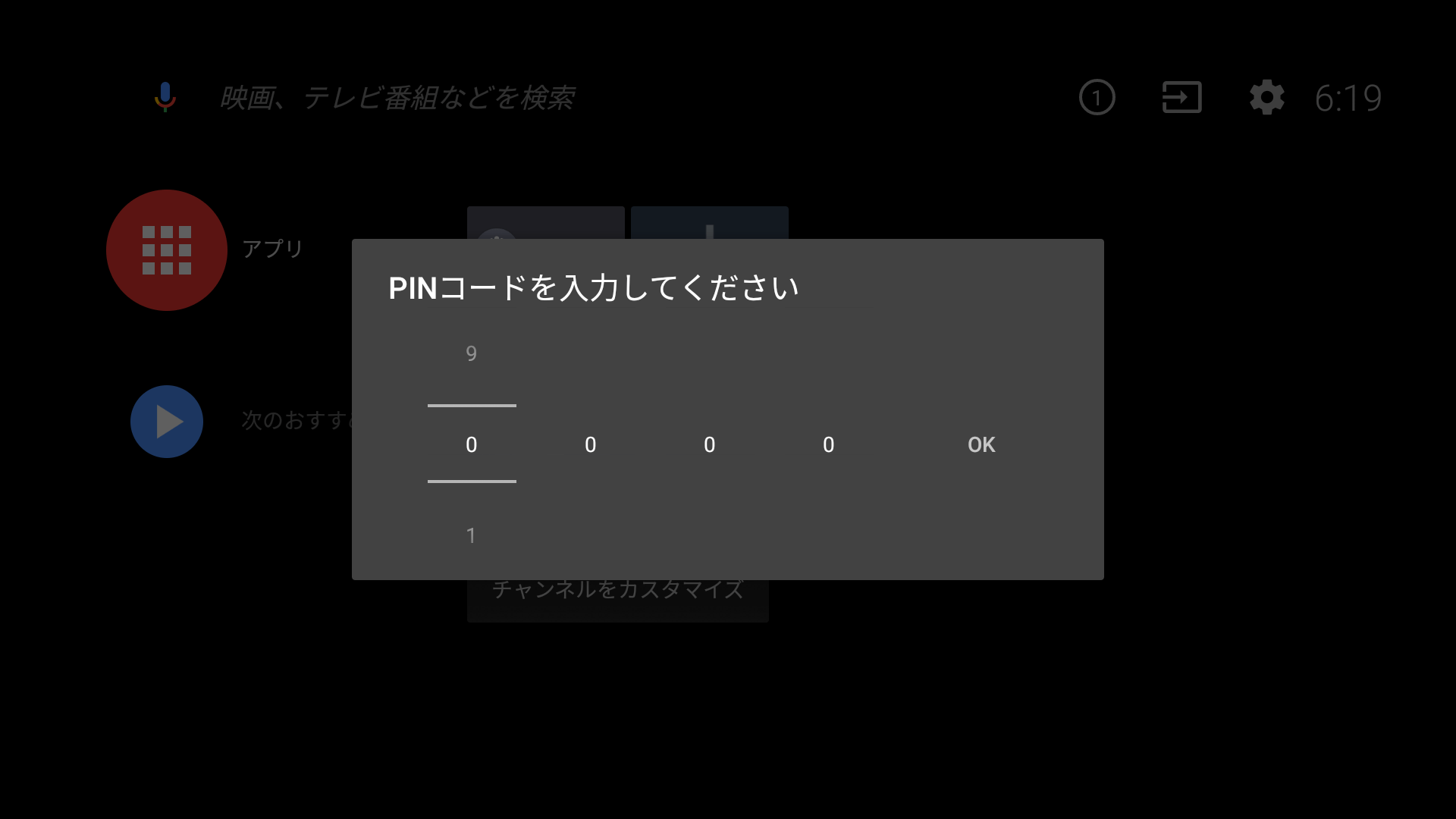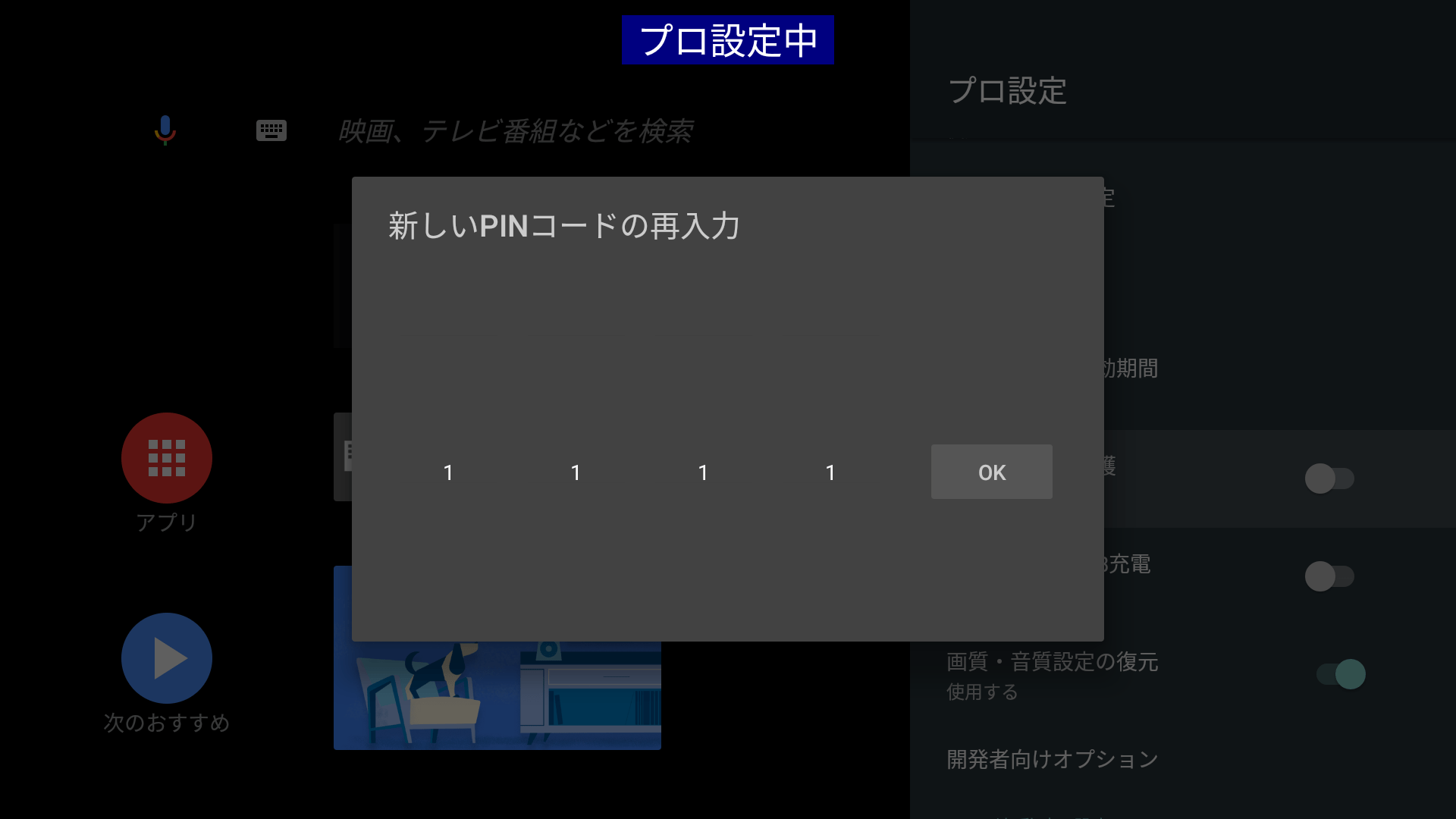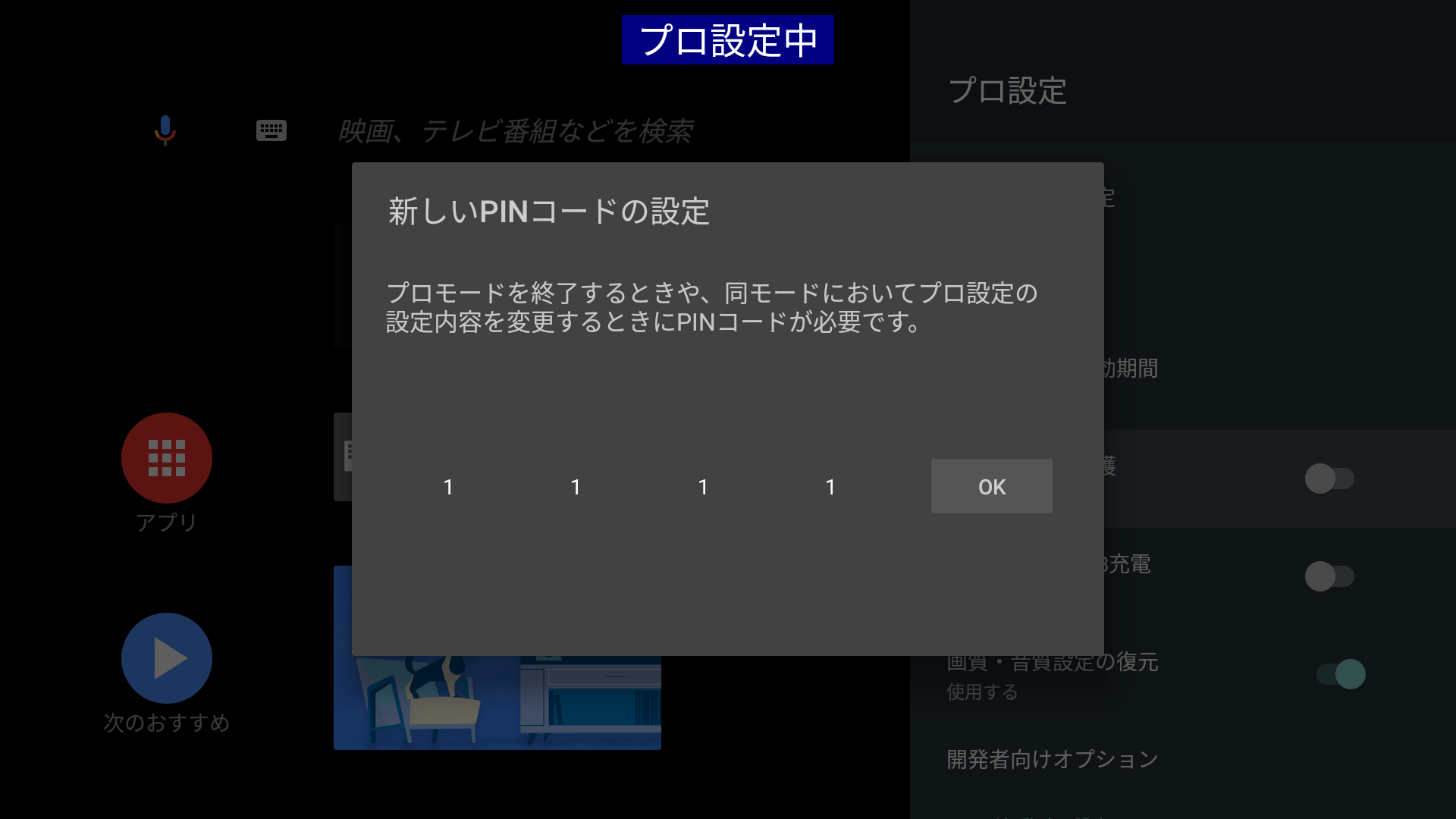 プロ設定モードへ切り替えるためのPIN入力を求められる画面が表示されます。