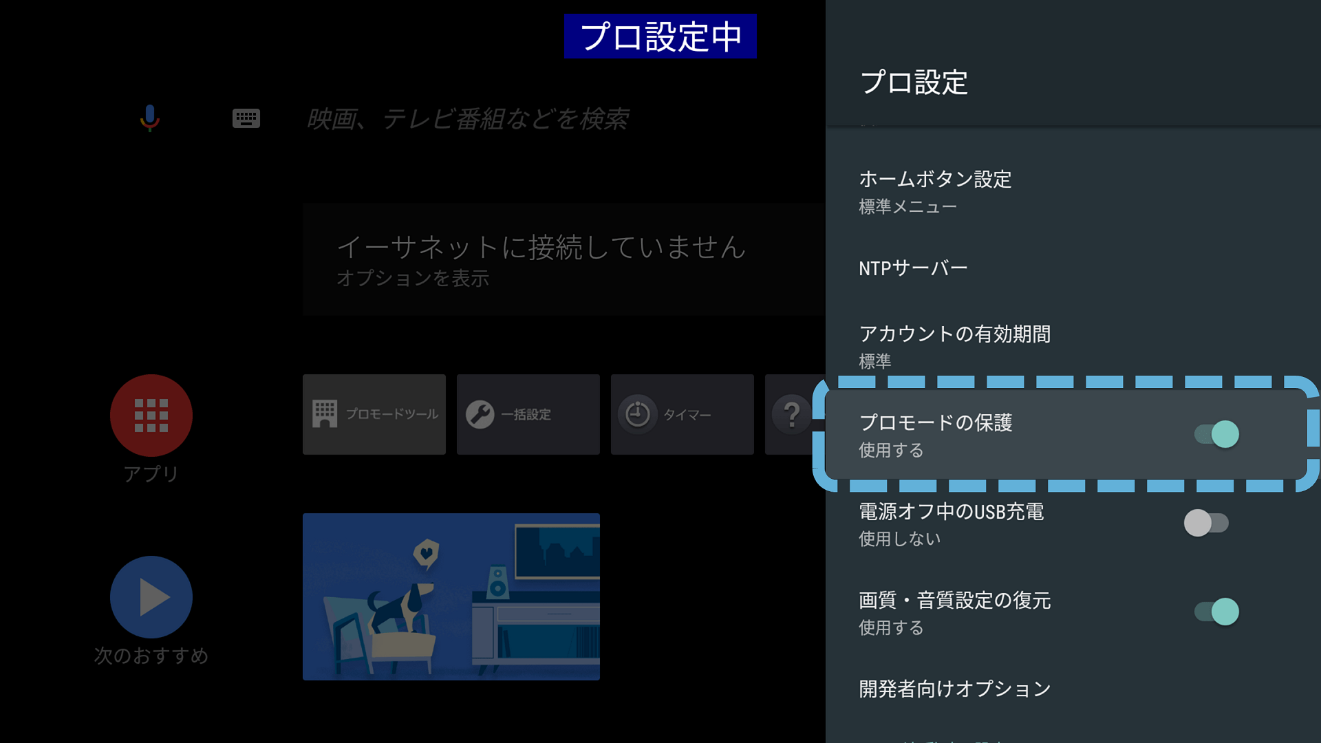 PINコードを設定することによりプロモードからプロ設定モードへの切り換えを制限し、運用中の予期せぬ設定値の変更から保護します。