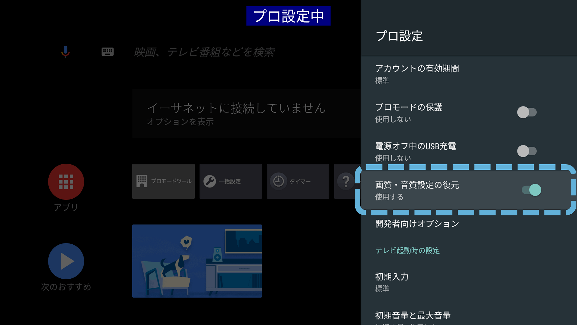 プロ設定時に設定した本機の画質・音質設定を電源をオンにした際に復元します。