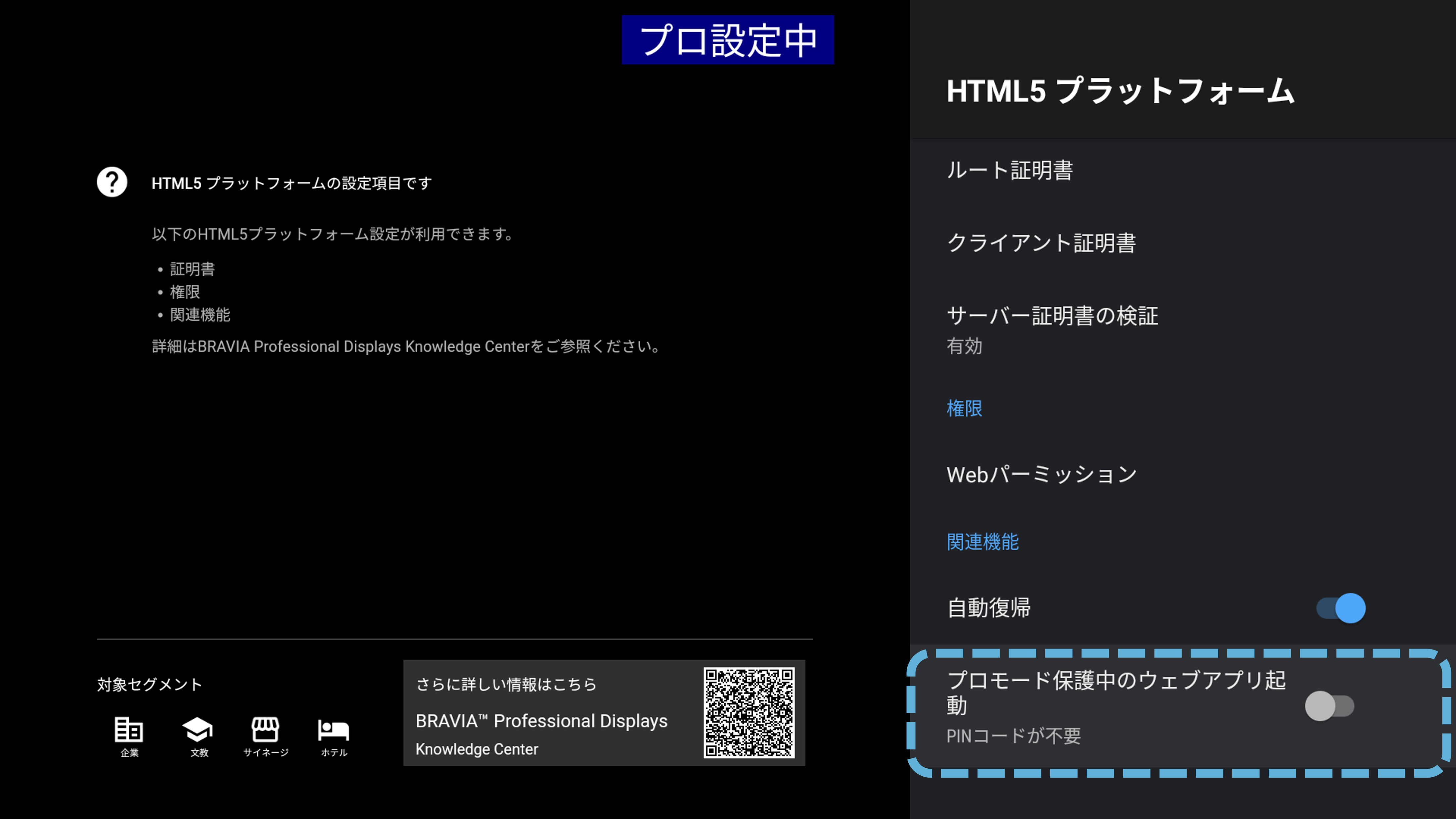 プロモードの保護機能を有効にしている場合に、ウェブアプリ起動時に PIN 入力を求めるかどうかを設定します。