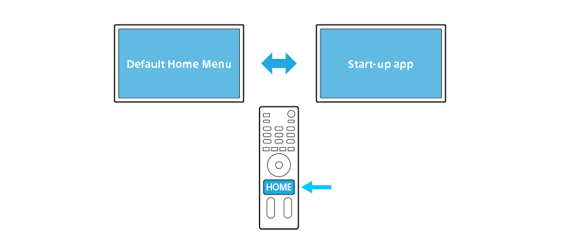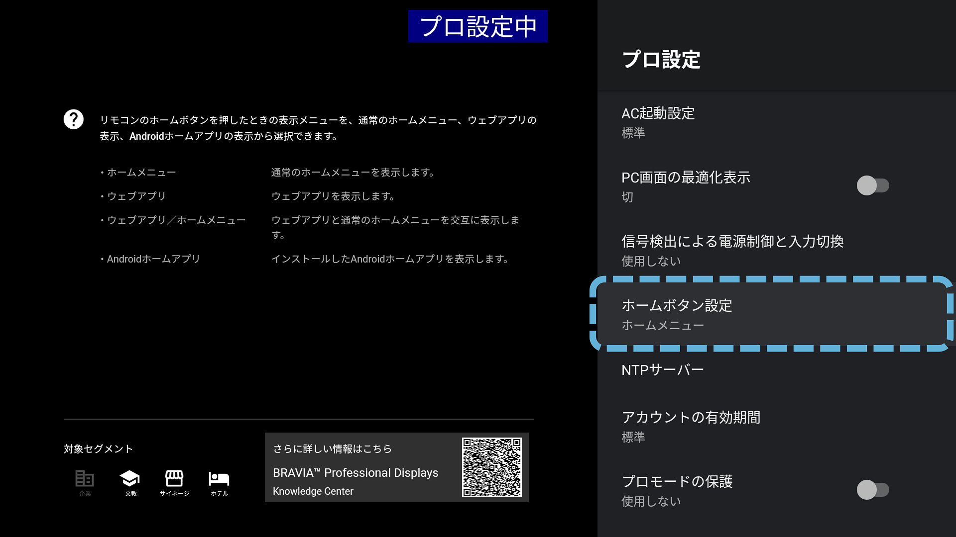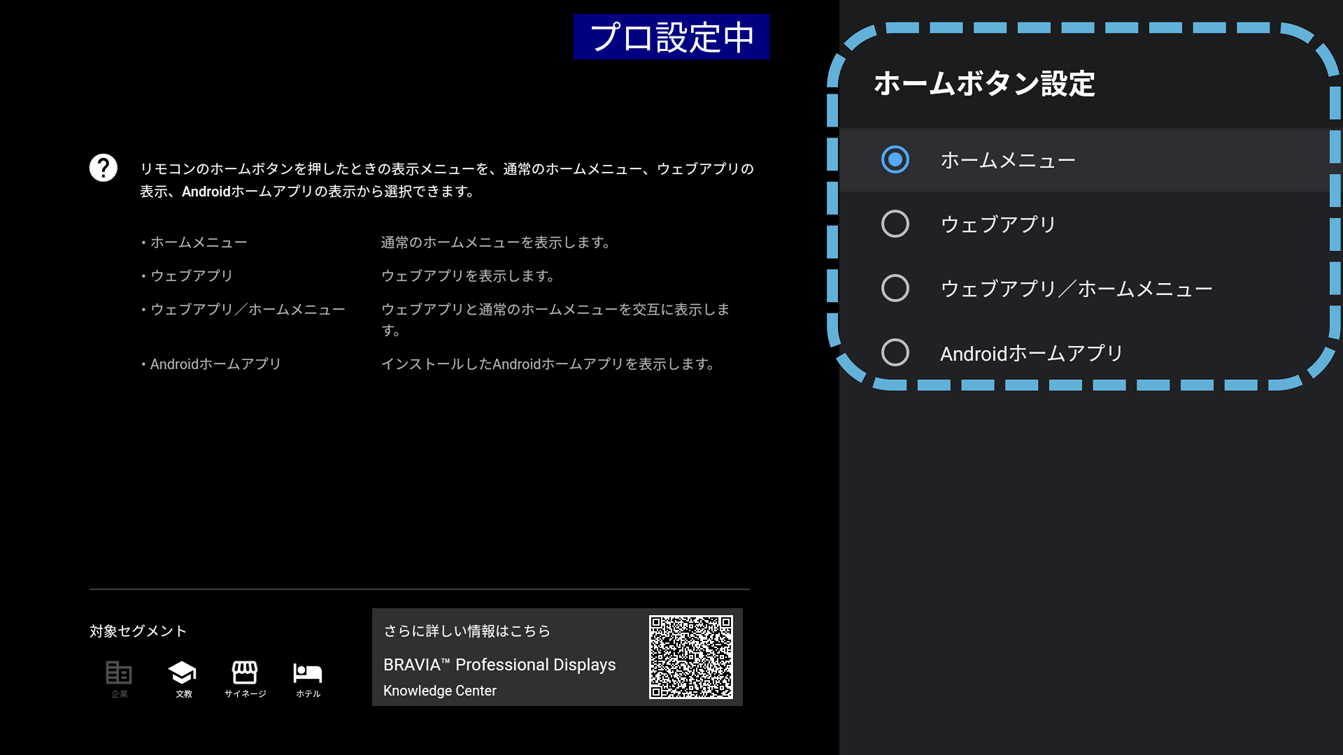 リモコンのホームボタンを押したときの表示メニューを、通常のホームメニュー、ウェブアプリの表示、Androidホームアプリの表示から選択できます。