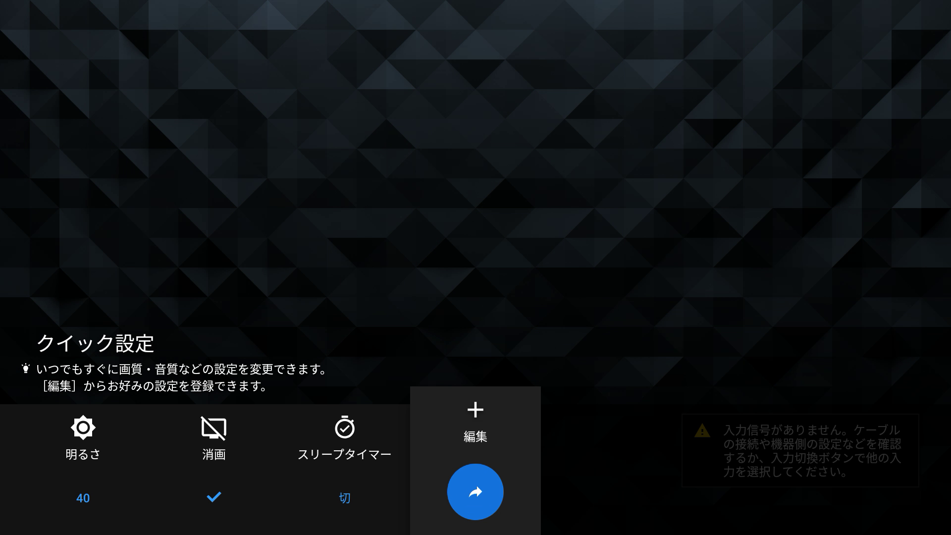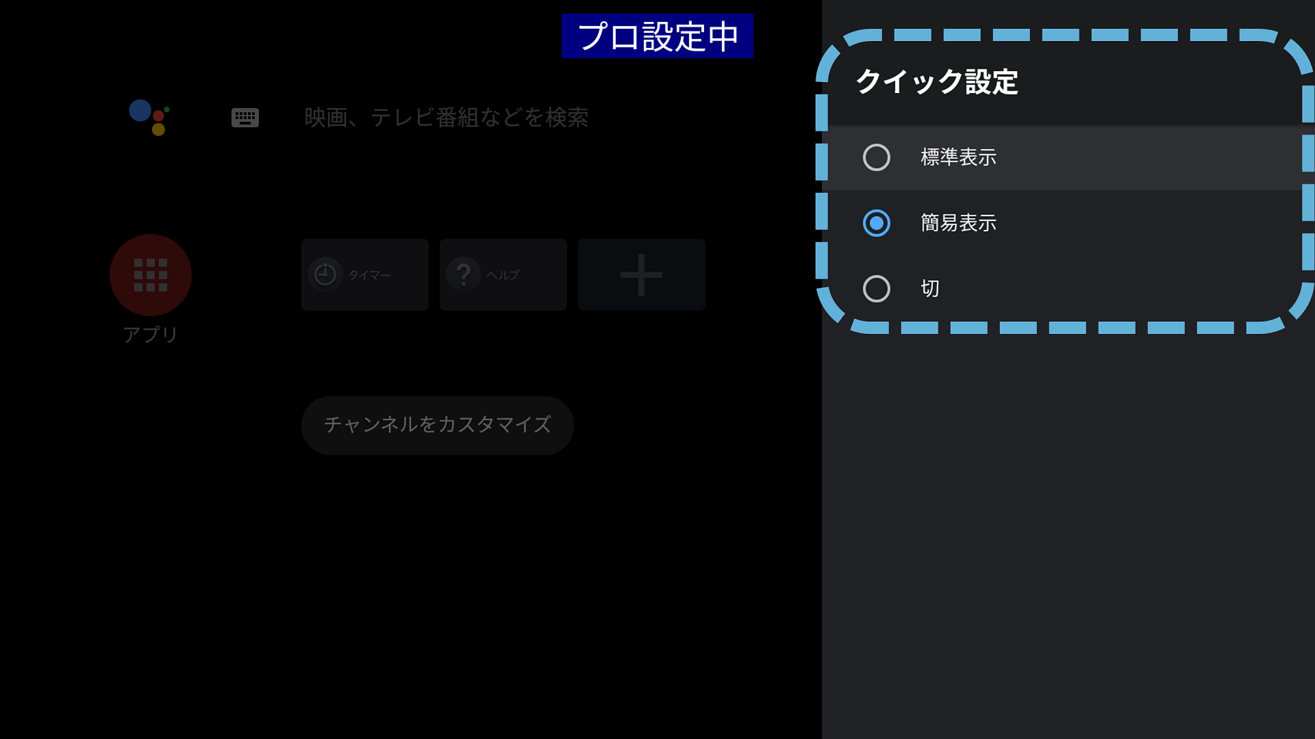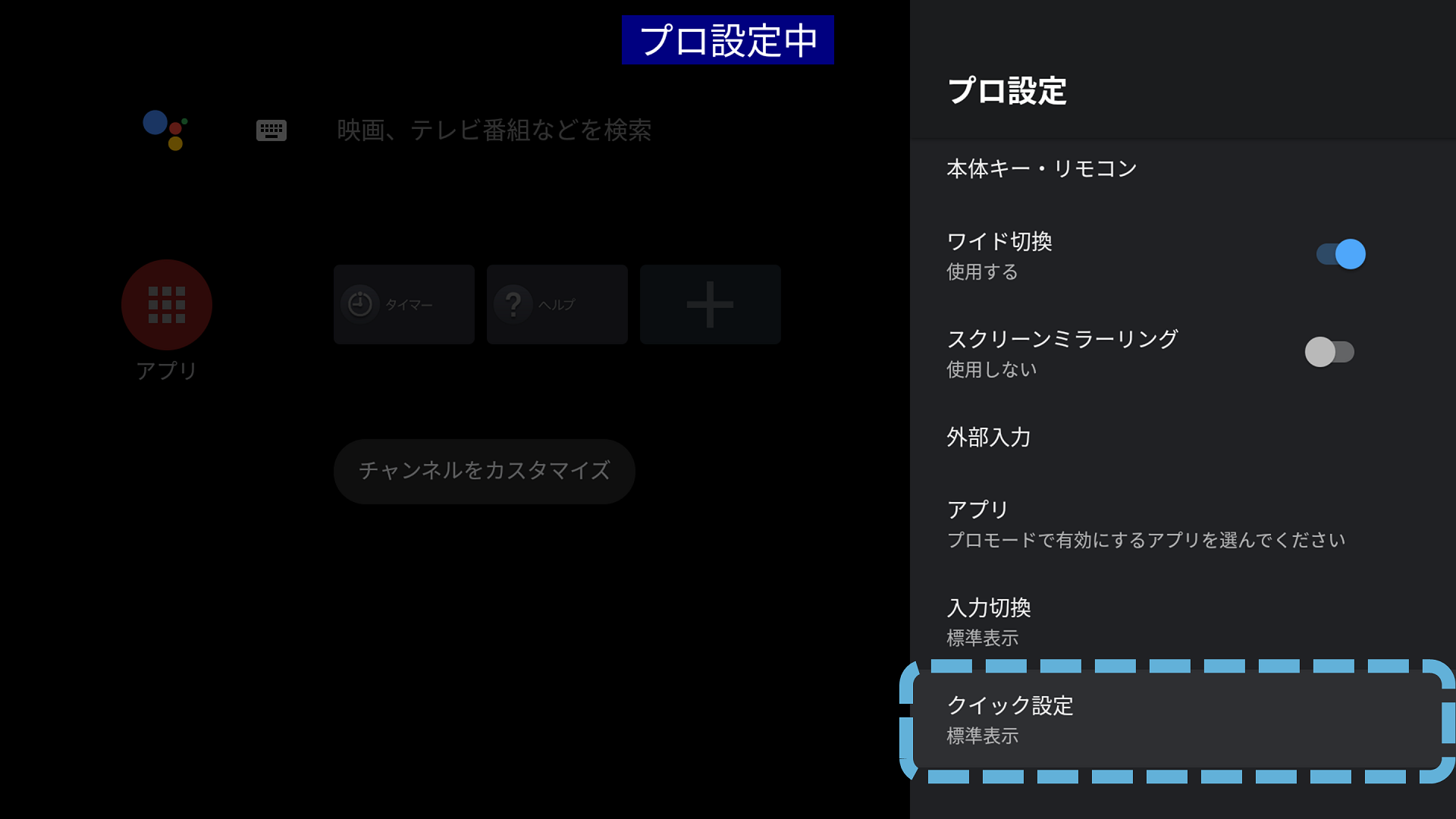 クイック設定の有効・無効を設定できます。クイック設定では、テレビ番組や動画を視聴しながら画質などを設定することができます。