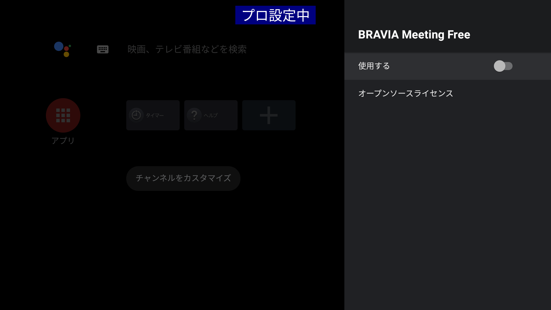 プロ設定の 起動サービス で、BRAVIA Meeting Freeを選択します。